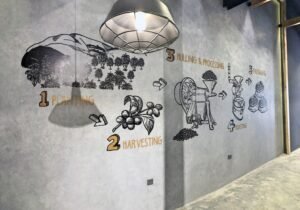 Nature-inspired murals creating a warm, welcoming dining atmosphere.